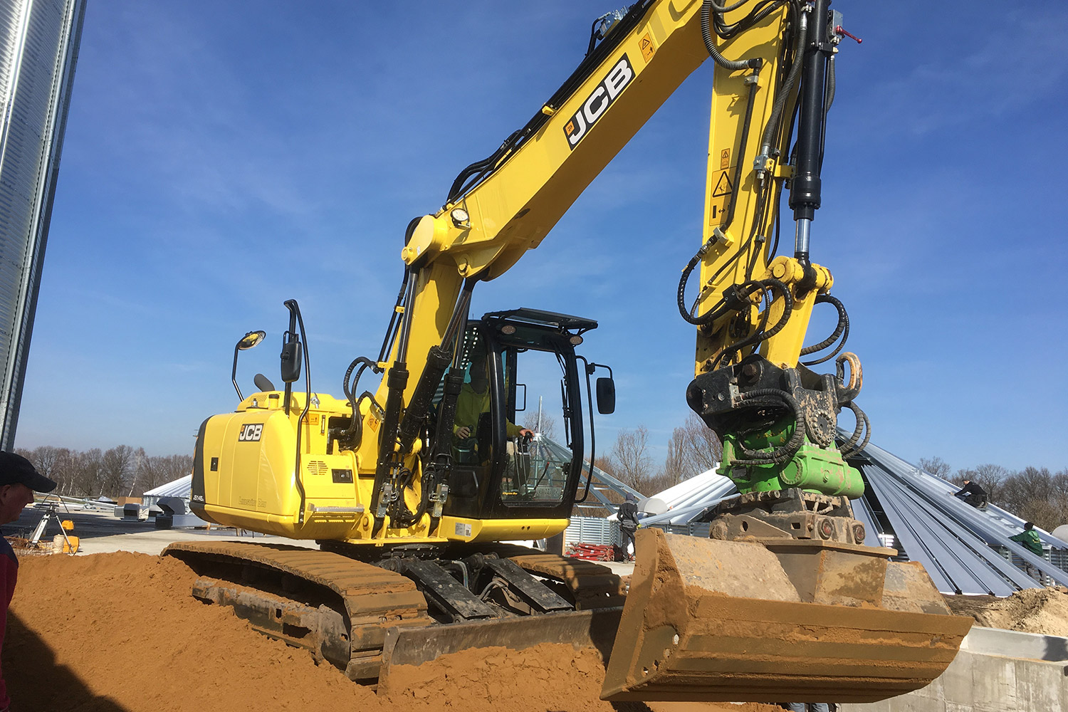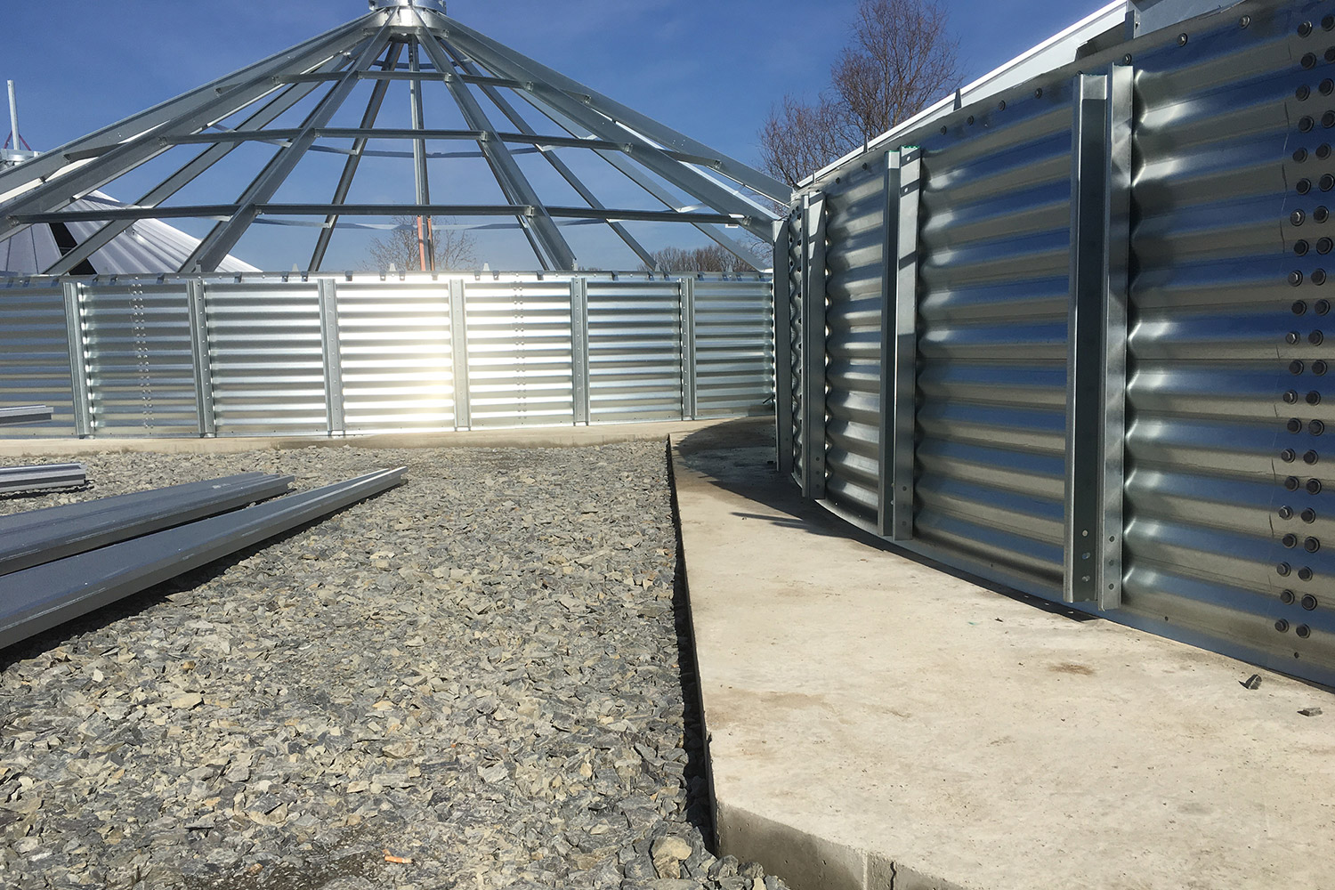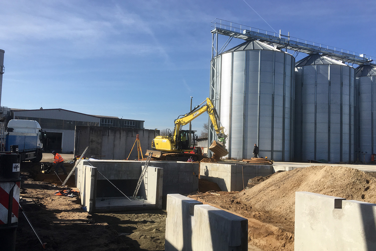 5000 m³ Bodenaustausch, acht Fundamente mit je 225 m² (Stärke 1,80 m) für Lagersilos und Abfüllgruben für Kornlager, verbaut wurden 4000 m³ Beton