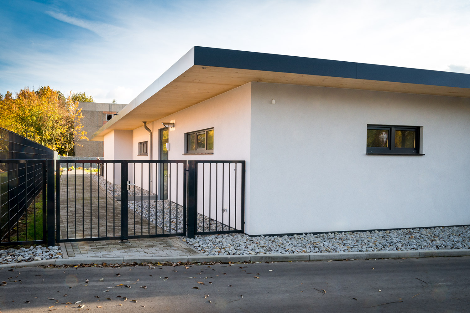Massivbau aus Porenbeton, Flachdach als Holzstapeldecke, Dachaufbauten als Holzrahmenbau, schlüsselfertig inkl. Außenanlagen
